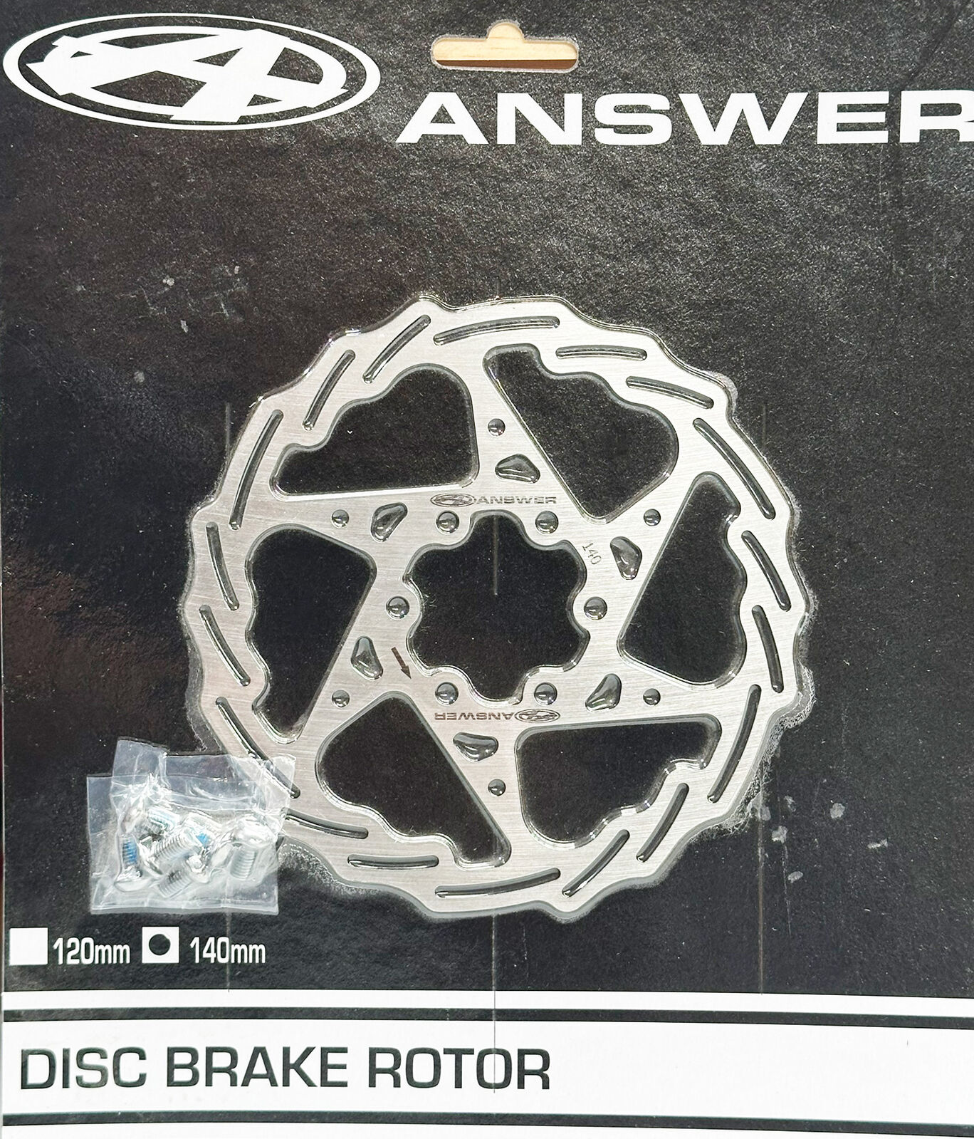 The Answer disc brake rotors are available in 120mm and 140mm and are single piece stainless steel for stiffness and longevity. Includes mounting hardware.