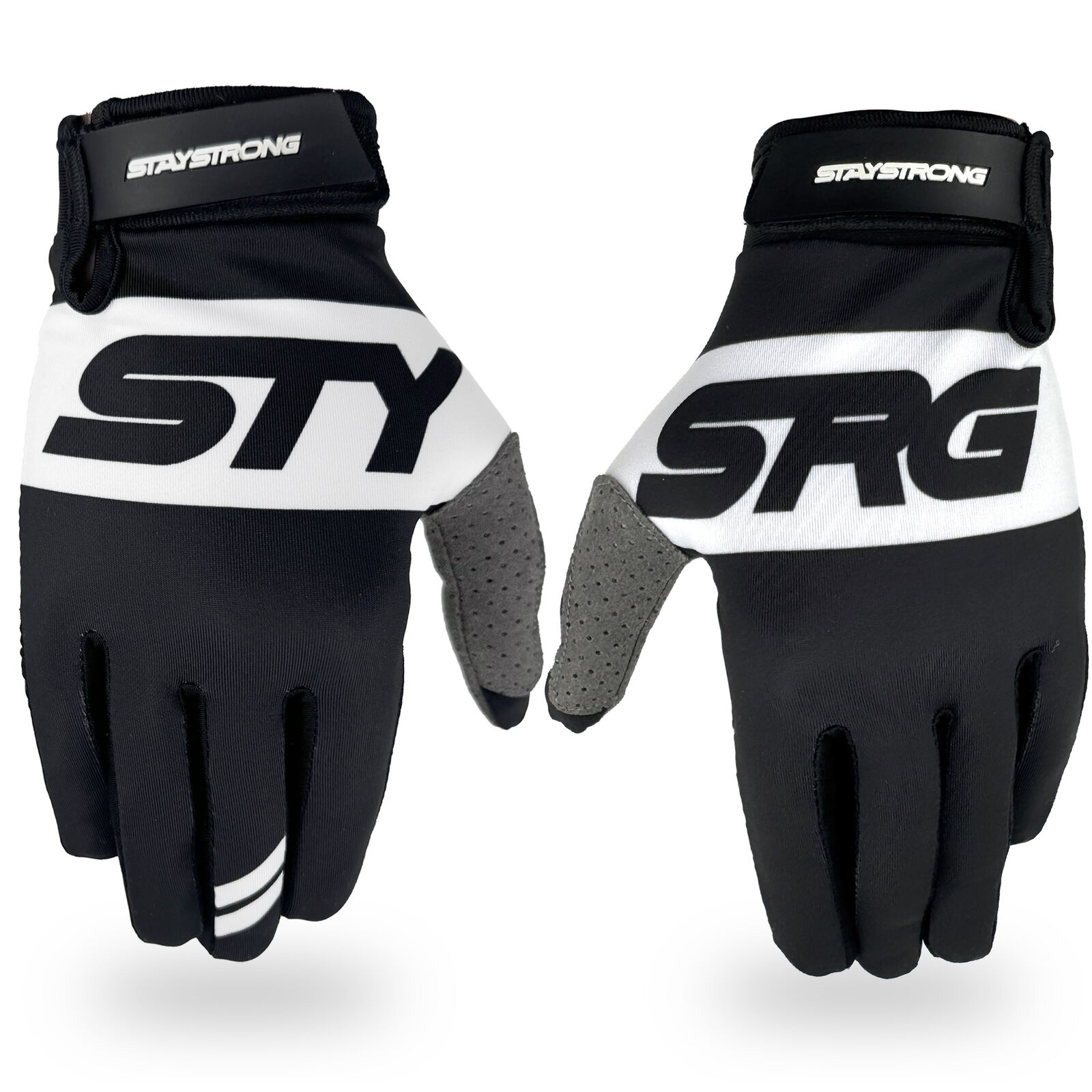 Stay Strong's lightweight, premium quality BMX/MTB gloves feature an updated Clarino fabric palm to provide grip, durability and ventilation, a soft lycra back for improved comfort, stretch and closer fit and silicone print fingers to help ensure maximum grip on the brake lever. All gloves come with an adjustable wrist strap for extra comfort.